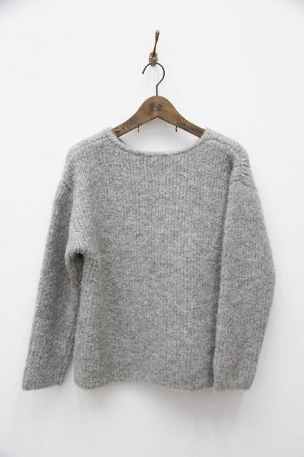 アルパカ(74%)とウール(26%)のみでループヤーンを紡績した毛糸で編み上げられたプルオーバーです。少しゆとりのある身幅で、ボートネックの首周り、サイドスリットが入った前後で段差のある裾のデザイン、リブは袖口のみに付くなど、シンプルでリラックス感のあるプルオーバーに仕上がっています。総針(フルニードル)でしっかりと編み上げているので、程良い重量感と弾力感、高い保温性があり、アルパカならではの滑らかな肌触りと相俟ってまるでウールのタオルに包まれているようなとても気持ち良い着心地になります。一般的に意匠糸(ファンシーヤーン)と呼ばれるこのような糸で化繊を混紡しないのはとても珍しいです。