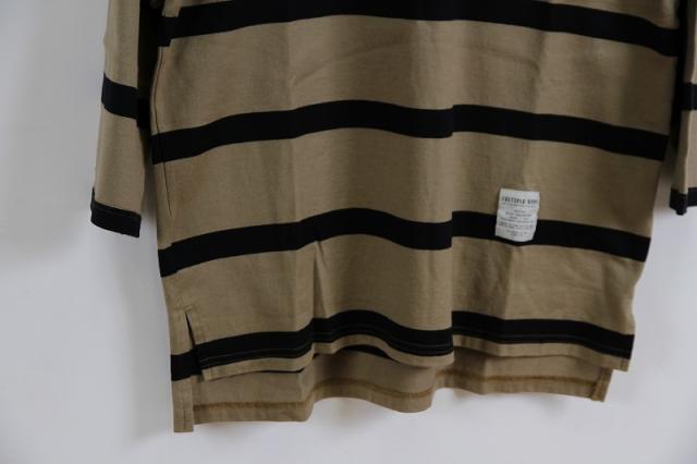 落ち着いた雰囲気のワイドピッチのボーダー柄でオーバーサイズ、8分袖で仕上げたデザインです。ワンウォッシュ済みの為、洗濯後の形状変化の心配もありません。