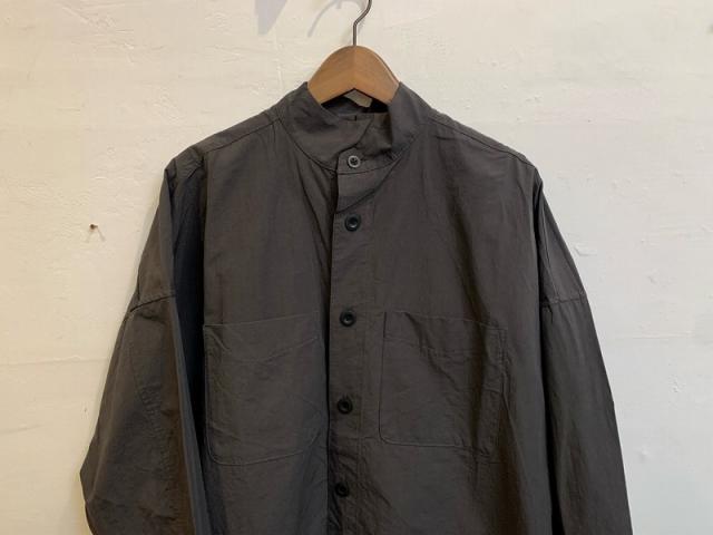 最大の特徴は、その独創的なパターンワーク。かなり広めに取った身幅、着物スリーブを思わせる変形的な形状の袖、スタンドカラーと通常のシャツカラーの中間のような、ウィングカラーにも似た襟など、細部にまでこだわり抜いたディテールが光ります。ヨーク下と下前に施されたテープもさりげないアクセントに。