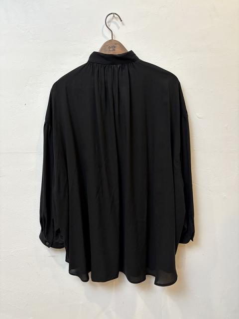 素材は再生繊維のリヨセルを100%使用。リヨセルは、天然素材由来であり、土に埋めるとそのまま自然に還るため、昨今謳われる、サスティナブルな素材になります。その極細番手で素材に最も合うサテン地を織り上げました。たっぷりボリュームをとりギャザーを寄せたので生フォーマルドレスのようなオーラを醸し出すアイテムです。お洗濯後は強いスチームをかけることを推奨致します。
