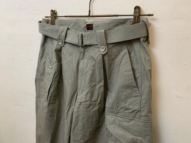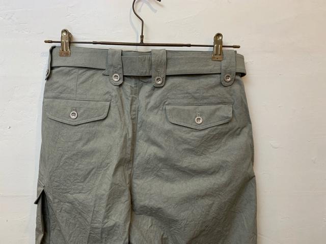 イギリス軍の40年代タイプのグルカパンツとベルギー軍のミリタリーパンツを融合させた、独創的なデザインに仕上げました。最大の特徴は、片側に配置されたガンポケットとカーゴポケット!私の大好きなアイテムを融合させたこのパンツは、共生地で長めに作ったベルトもアクセントになっています。