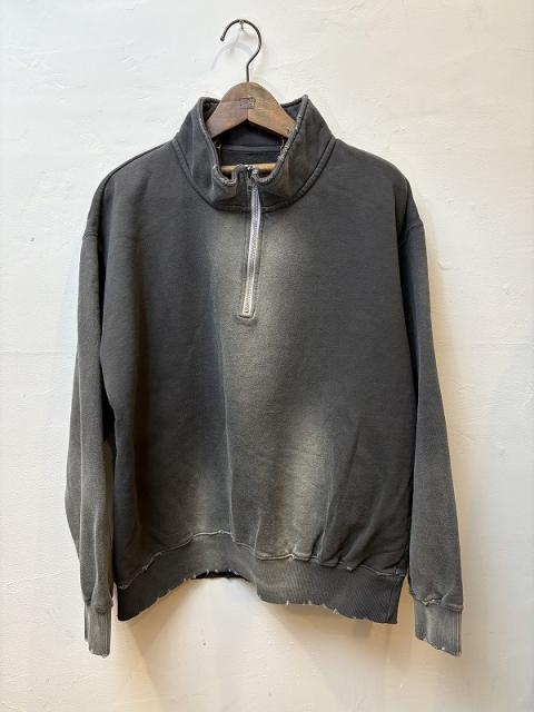 ムラ染めが特徴のハーフジップスウェットシャツ。初秋からちょうどいい厚みの10オンスの裏毛をスウェットに仕立て、製品染めとダメージ加工によりヴィンテージライクな雰囲気に仕上げています。ベーシックなシルエットでデニムと好相性!色違いで欲しくなるような幅広いカラー展開とスタイリングに映える発色で、一枚でも様になるアイテムです。
