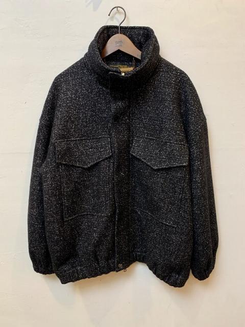 「クラシカルな素材と現代的なシルエットの融合」というコンセプトから生まれたミリタリージャケットです。フォーマルな場にも映える霜降りウールを使用し、伝統的なドレス素材とミリタリーテイストの意外な組み合わせによる新鮮な魅力を創出しています。