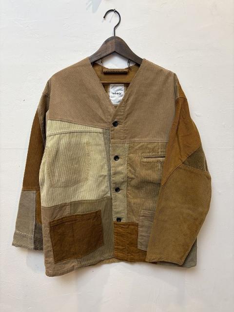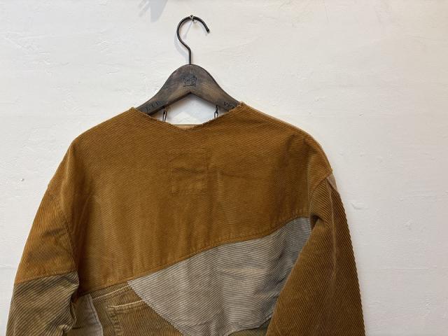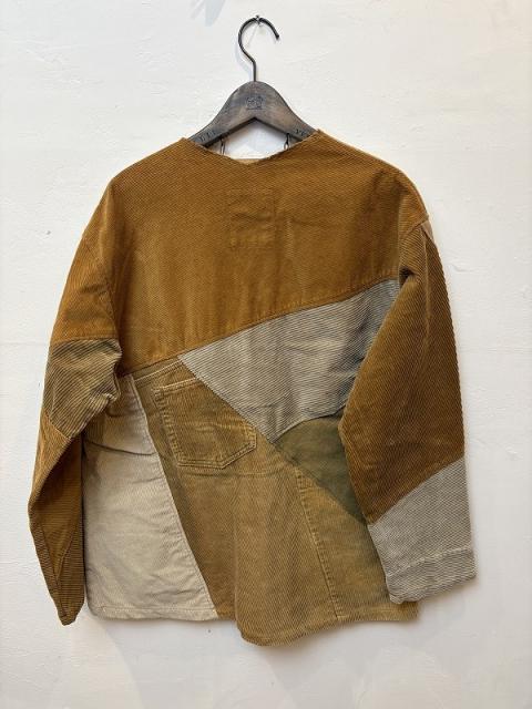 ユーズドのコーデュロイウェアを解体し、再構築したノーカラージャケット。解体する前のボディのディテールを活かしたパッチワークになっており、職人の手により一点一点組み合わせて作られています。