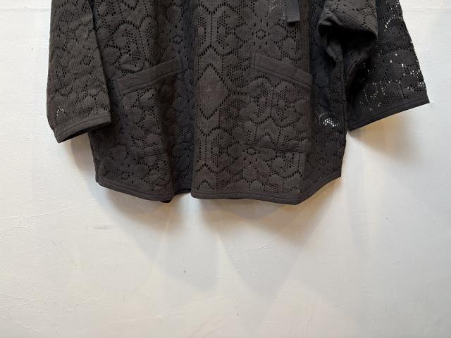 インドレースを使用したフーディタイプのブラウス。ヴィンテージ感のあるレースはシアー感があり、前ボタンを開けてレイヤードを楽しむスタイルがおすすめです。カジュアルなフーディーデザインがデニムと好相性で、薄手のインナーの上にさっと羽織るだけでスタイリングのアクセントになるアイテムです。