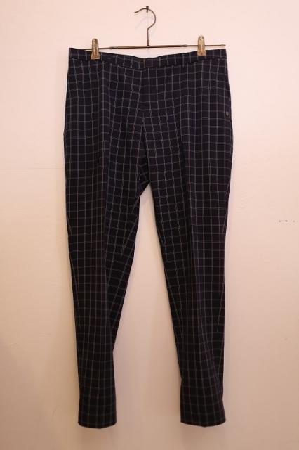 季節を問わず穿きやすいネイビーのチェックパンツです。 太ももがゆるく、足首が細くなったカットがとてもエレガントです。メゾンスコッチのメタルロゴがフロントポケットの下に縫い付けられています。