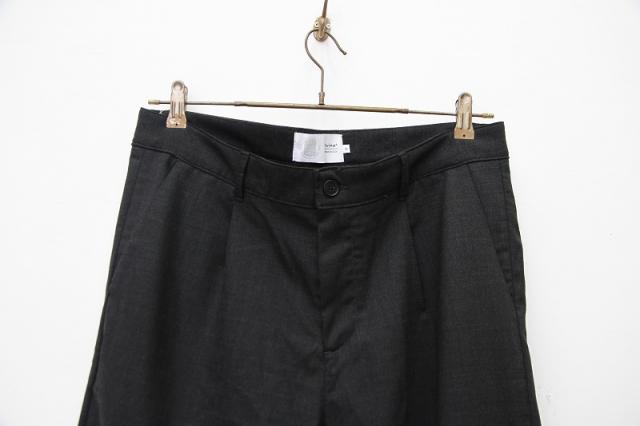 テーパードシルエットのタック入りスラックスです。ポリエステルとウールにストレッチ素材を混合した生地でスーツスラックスのマットな質感ながら、伸縮性抜群です。バックポケットにはフラップが付いてます。ゆったり目の太ももから裾にむかって綺麗なラインに仕上げられたシルエットが格好良く、履き心地の良いテーパードパンツです。