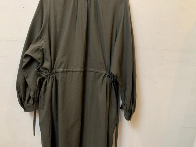 インド綿にカシミヤを5%混紡することで、ほんのりしっとりとした触感が加わったシャツ用ビエラ生地を使用し、襟元、背中、袖口、ウエストにたっぷりとギャザーを寄せたシャツドレスを製作しました。ウエストに共布スピンドルを通すことで、シルエットが大胆に変えられるのもこのシャツドレスの特徴です。通年着用できる、とても雰囲気のあるアイテムです。