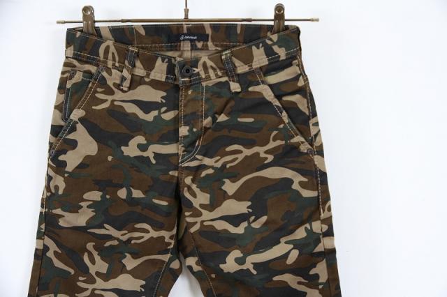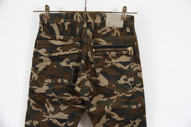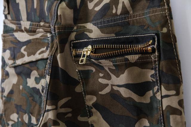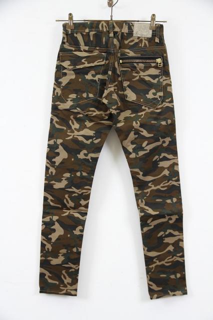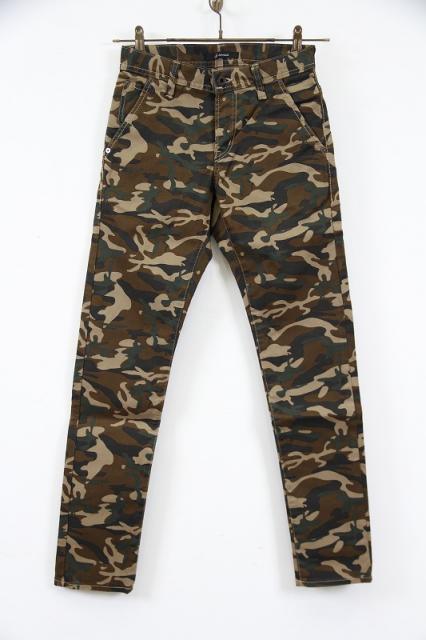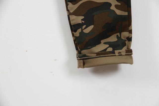 カモフラ柄が特徴のカラーパンツ。デザインは裾に向かうにつれて細くなるテーパードスリムのシルエットです。バックポケットにジップを配置してポイントを作っています。糸の打ち込みをしっかりと行い、高い耐久性を持たせました。