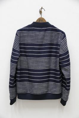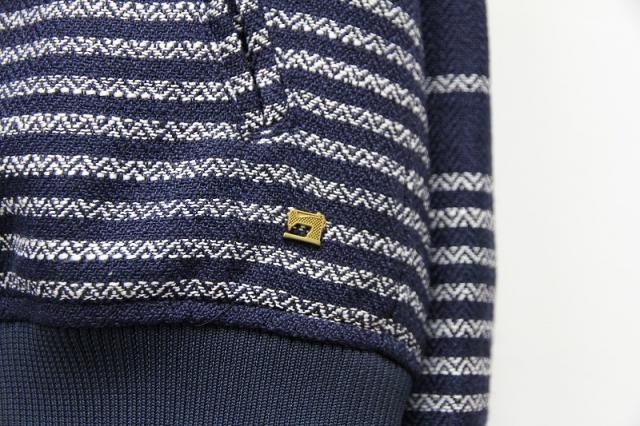 フルジップのブルゾンです。ボーダーが特徴でコーディネートのアクセントにしてもバランスがとりやすい配色です。光沢のある糸を織り込んでいるためカジュアルすぎず、キレイにも着て頂けます。春秋にざくっと羽織れる使いやすいアイテムです。