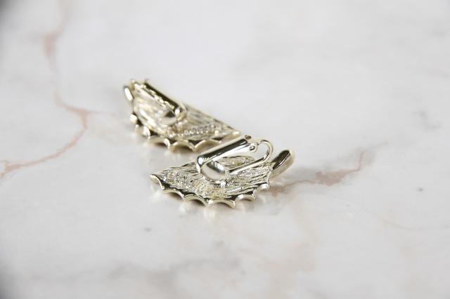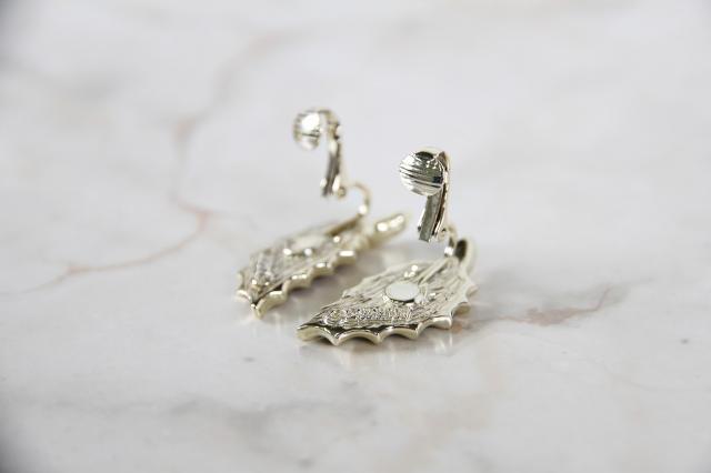 Sarah Coventry社製、葉っぱのモチーフのイヤリングです。葉のブラウンはウッドでできていて、よく見ると木目が見えます。耳の形に添って着けられ、イヤーカフのような雰囲気もあります。