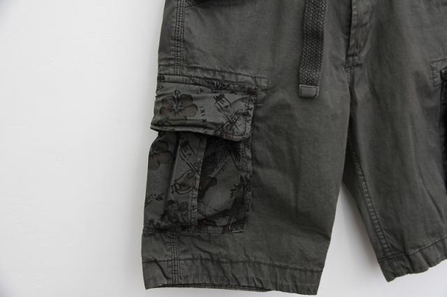 ポケット部分の花柄が色気を感じさせる、ベルト付きショートパンツです。しっかりした生地感でカーゴパンツのテイストを盛り込んでおります。全体的に落ち着いた色味なため、コーディネートに迷わずラフに穿くことができます。