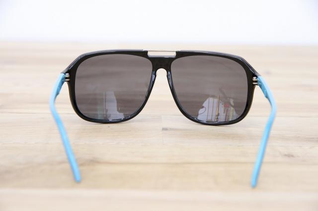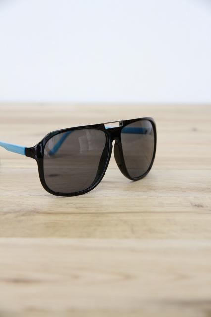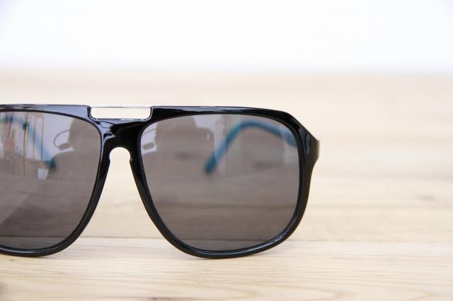 テンプル(耳に掛ける部分)がブルーの差し色になった、ヴィンテージのサングラス。ティアドロップ型で、たまご顔の方や面長顔の方に似あうデザインです。