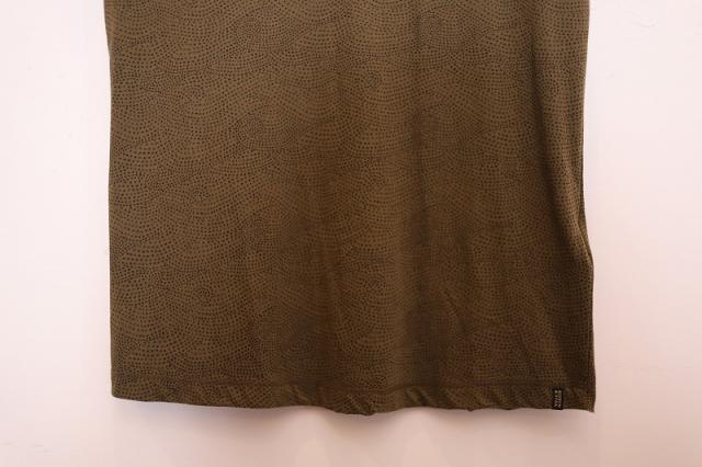 波紋のように広がるドット柄のプリントが特徴的なティーシャツ。肌ざわりがよく、ひんやりと涼しいレーヨンを含んでいるため夏でも快適な着心地です。