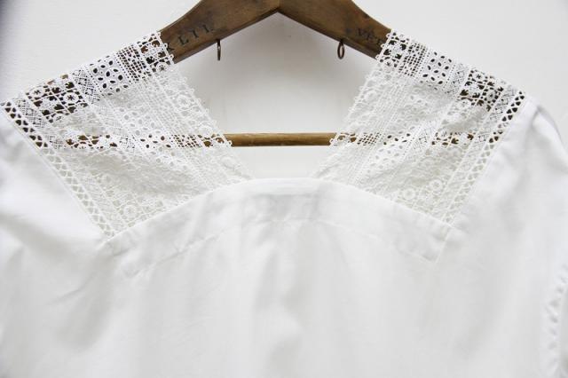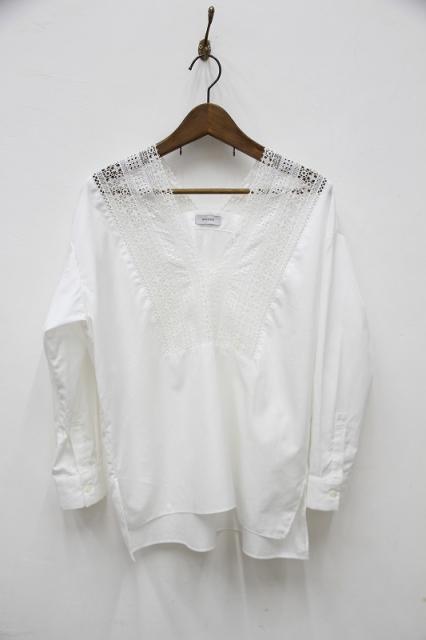 衿元の綺麗なレースが首元をスッキリ美しく見せてくれる、Vネックのプルオーバーシャツです。複雑な職人技のレースが高級感を醸し出します。