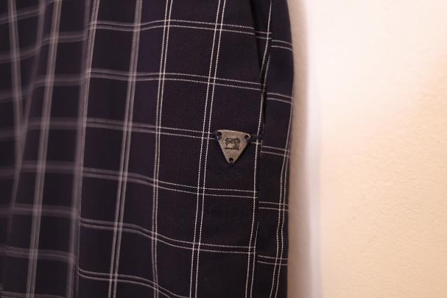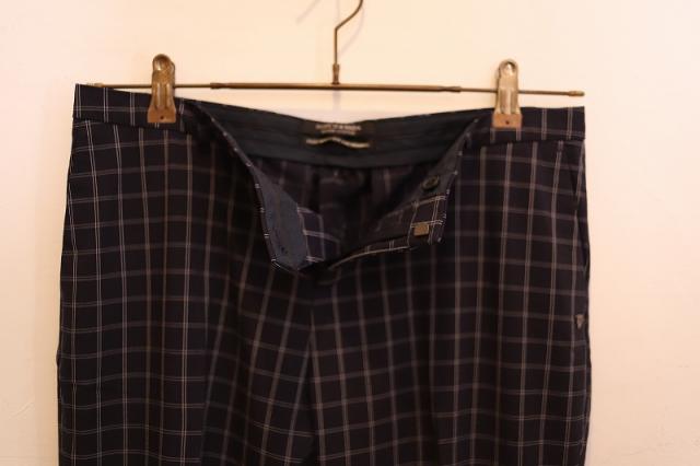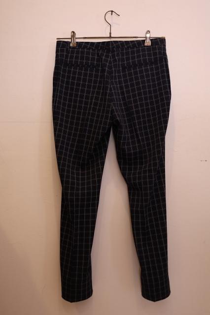 季節を問わず穿きやすいネイビーのチェックパンツです。 太ももがゆるく、足首が細くなったカットがとてもエレガントです。メゾンスコッチのメタルロゴがフロントポケットの下に縫い付けられています。