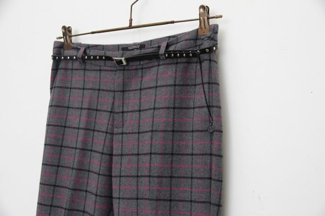 ウールのような肌触りと暖かさを兼ね備えたスラックスパンツ。グレーを基調にピンクと黒のラインが入ったチェック柄です。無地のニットやアウターと合わせて秋冬のコーディネートのアクセントになる一本です。センタープレスが入っておりしっかり見えします。