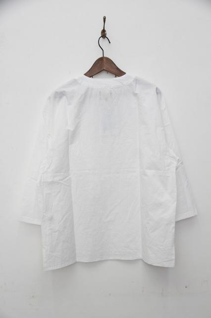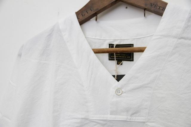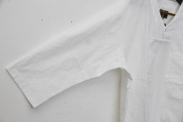 コットンのダンプ素材を使用しています。60年代のルーマニア軍のスリーピングシャツをモディファイしたデザイン。V-NECKとHENRY-NECKがMIXしたネックラインが特徴です。大人っぽくサラッと着用出来るアイテムです。袖は七分丈。硫化染めのトリプルウォッシュ加工により雰囲気のある仕上がりになっています。
