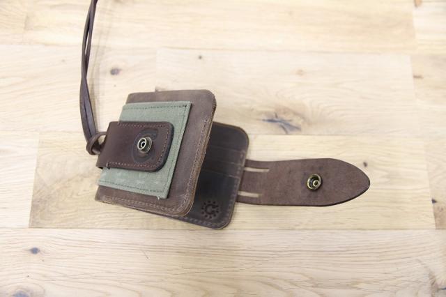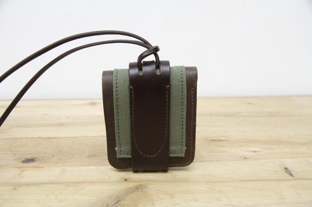 職人の手作業で作られたレザーの財布です。サドルカウハイドレザーを使用し、使うほどに美しい仕上がりに。1970年代にさかのぼるイギリス軍のダッフルキャンバスを挟み込んでおります。スナップボタン付きのベジタブルタンニンレザーのストラップボタンで閉じられます。紙幣入れ)×1、カード入れ×6と、一つのお財布で充実のスペックと使い心地を実現。取り外し可能なレザーネックレスストラップ付きです。