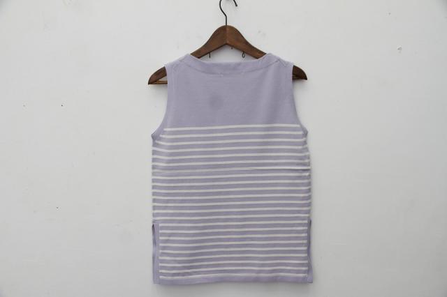 強めに撚りを加えたコットンナイロンを使用したノースリーブトップス。ナイロンを使うことですっきりとしたシルエットながら程よいハリがありボディラインを拾いにくくなっております。首回りをやや締めてありますので、肌が露出し過ぎず上品な着こなしができます。鮮やかなカラーでインナーとしてスタイリングポイントにも。
