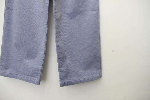 14wの細目のコーデュロイを使用。二重織の組織で柔らかくストレッチもきいているのでとても履きやすいアイテムです。裏側を起毛することで、ウォーム感も出しています。ウエストのゴム仕様、ストレッチ感によりイージーに履けるワイドパンツになっております。