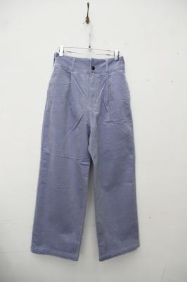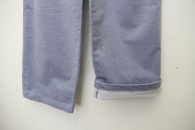 14wの細目のコーデュロイを使用。二重織の組織で柔らかくストレッチもきいているのでとても履きやすいアイテムです。裏側を起毛することで、ウォーム感も出しています。ウエストのゴム仕様、ストレッチ感によりイージーに履けるワイドパンツになっております。