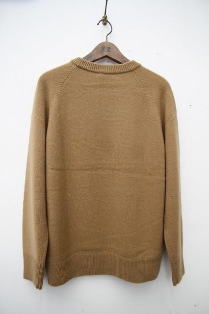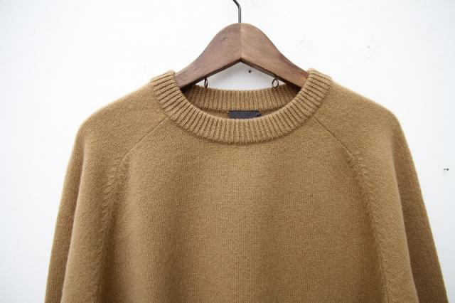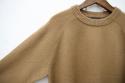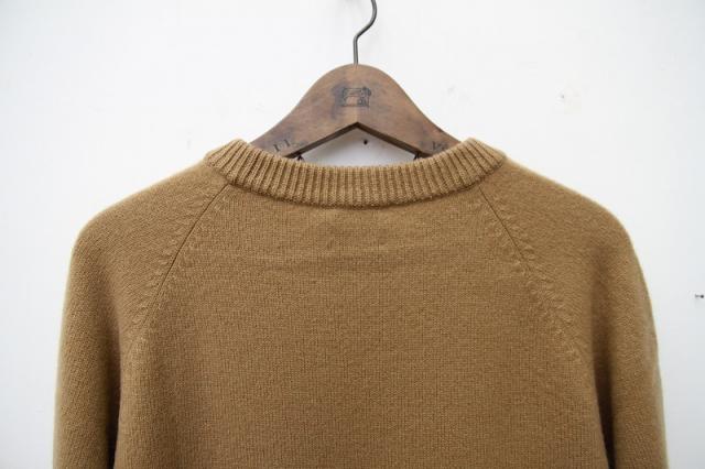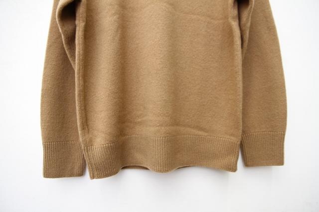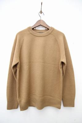 素材は、オーストラリア産メリノウール(バージンエクストラファインウール)で、「SUPER 110」に相当する超極細繊維です。軽くて膨らみのある糸を作るために、カシミヤ用の紡績機で、カシミヤ糸と同じ手法で紡績しております。そのため、触った時のしっとり感、軽さ、ソフトで弾力性のある膨らみなどのバランスが良く、ウール100%とは思えないほどの肌触りです。東北の手横編み機職人に時間をかけて編んで頂いた、至れり尽くせりのシンプルなニットウェアです。