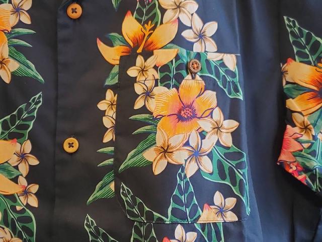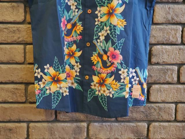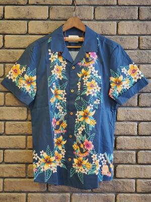 フロントはもちろん、袖とバックした部分に施されたプリントがアクセントのオープンカラーシャツです。ネイビーベースなのでアロハシャツの中でも大人の雰囲気を演出するデザインです。