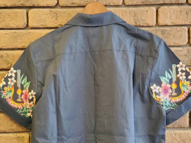 フロントはもちろん、袖とバックした部分に施されたプリントがアクセントのオープンカラーシャツです。ネイビーベースなのでアロハシャツの中でも大人の雰囲気を演出するデザインです。