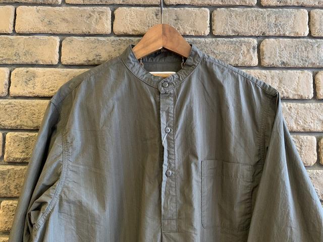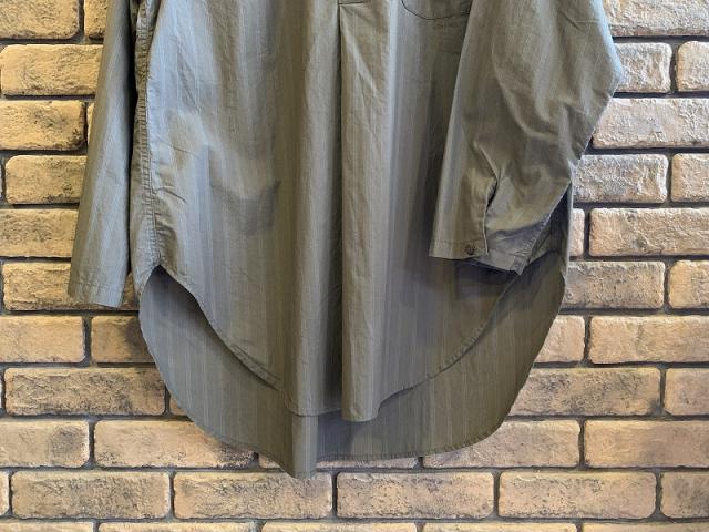 グランパシャツを現代より着用しやすくアップデートしたアイテム。裾のラウンドやフロントに施されたタックといったスリーピングウェアなどに見られるディテールが特徴です。