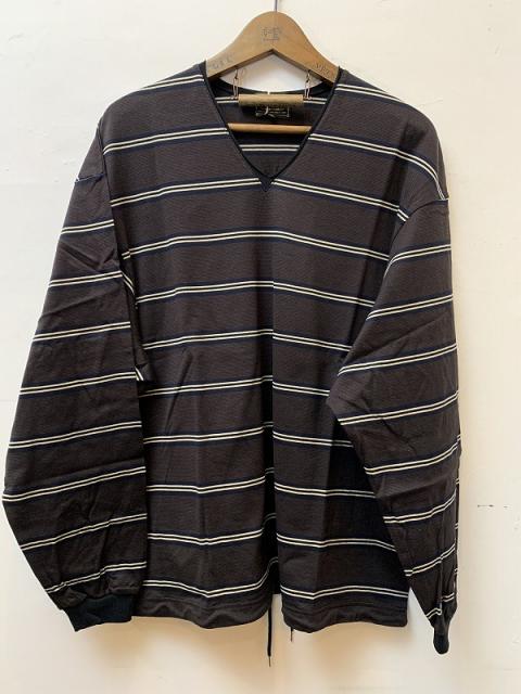 70年代の古着をイメージしたボーダー柄をコットンコーマ糸を使用し、シルケット加工することにより、表面感が綺麗で適度に光沢感を持たせたオリジナル生地を使用したカットソーです。レギュラー気味の肩幅にワイドな身幅の身頃に、ワイドな袖を付けたシルエットになります。裾のコードは途中からゴムに切り替える事により伸縮性を持たせてあるので縛ったままでの着用が可能です。