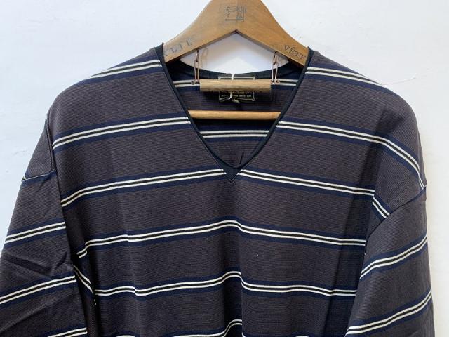 70年代の古着をイメージしたボーダー柄をコットンコーマ糸を使用し、シルケット加工することにより、表面感が綺麗で適度に光沢感を持たせたオリジナル生地を使用したカットソーです。レギュラー気味の肩幅にワイドな身幅の身頃に、ワイドな袖を付けたシルエットになります。裾のコードは途中からゴムに切り替える事により伸縮性を持たせてあるので縛ったままでの着用が可能です。