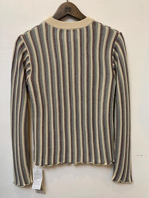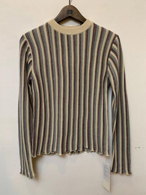 コットンアクリル糸を使用したニットプルオーバー。ニュアンスのあるストライプ柄の表情ときれいな配色が新鮮な一枚です。12ゲージの細い糸を緻密に編み込んでおり、柔らかく滑らかな風合いに仕上がっております。
