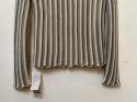異なる二本の糸を使用し、ガーター編みで仕上げた生地を横使いにすることで繊細なストライプ柄を表現しています。表裏のストライプのピッチをずらし、ガーター編みのピッチもランダムにすることで、ニット特有のグラデーション状のストライプ柄となっております。