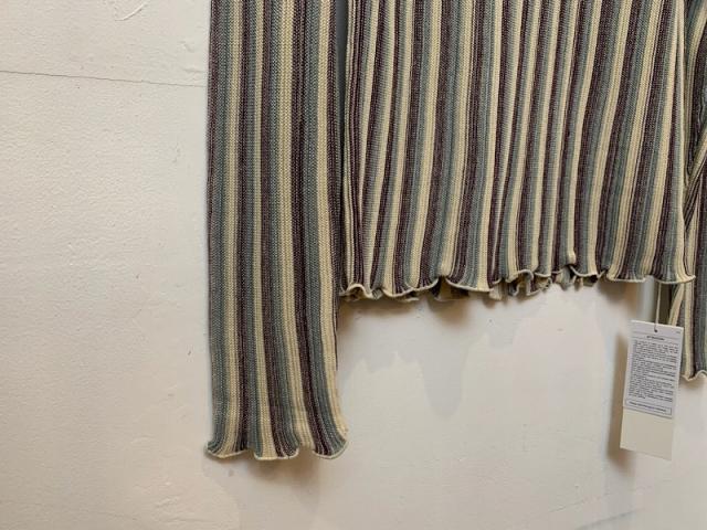 異なる二本の糸を使用し、ガーター編みで仕上げた生地を横使いにすることで繊細なストライプ柄を表現しています。表裏のストライプのピッチをずらし、ガーター編みのピッチもランダムにすることで、ニット特有のグラデーション状のストライプ柄となっております。