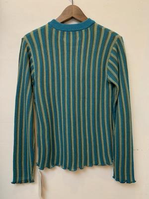 異なる二本の糸を使用し、ガーター編みで仕上げた生地を横使いにすることで繊細なストライプ柄を表現しています。表裏のストライプのピッチをずらし、ガーター編みのピッチもランダムにすることで、ニット特有のグラデーション状のストライプ柄となっております。