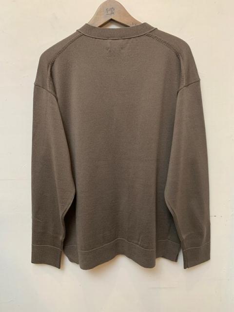素材はイタリアの老舗紡績メーカー、ゼニアバルファ社が[CASHWOOL]として特許を取得しているメリノウール100%糸を使用したVネックカーディガン。豪州産のエクストラファインメリノウールをイタリア国内で、独自の特許システムで紡績、防縮加工を施しました。世界的に[非の打ち所がない糸]と言われております。特徴は、シルクのような光沢、カシミヤのような優しい肌触りに加え、毛玉ができにくい点です。(羊毛の表面を削らずに、繊維表面のうろこ状のスケールを削っているため)それにより編地の厚み、弾力性を維持しながらもニットウェアの欠点を軽減しました。素材は勿論、機能的にも優れた[CASHWOOL]をお試しください。ハイゲージニットは天竺だと少々頼りなくあがりがちなため、よりしっかりした厚みがでるスムース編みにしました。ハイゲージニット生産を得意とするニッターによる、シンプルでも一目で「良いニット」とわかる仕上がりになっております。