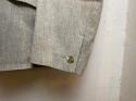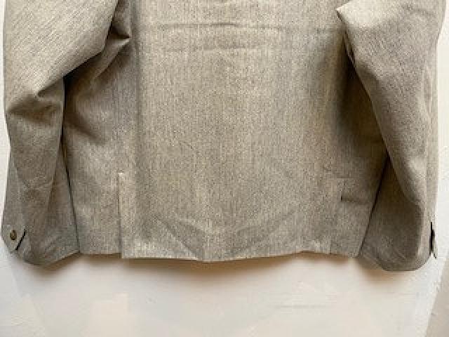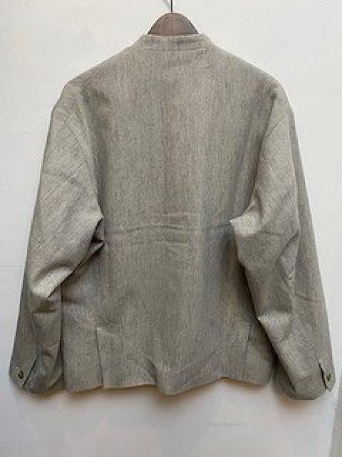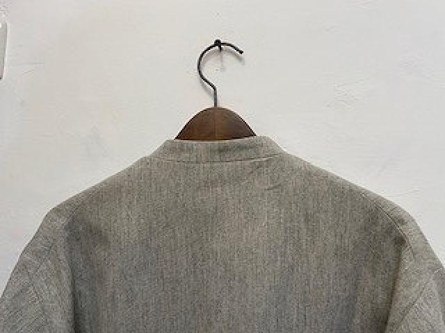ウール混の柔らかいフラノ素材を使用しています。古い時代のイギリス軍のホスピタルチェルシージャケットをサンプリングしました。ワイドな身幅から裾に向けて狭くなった短めな丈の身頃、ワイドにしっかり振りの付いた袖、多めについた釦、少しVに開いたスタンド衿など袖を通した際にグッとくるアイテムです。肩線を後ろに振る事により柔らかいショルダーラインを出しています。