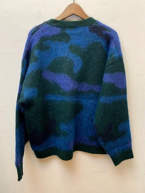 膨らみのあるモヘア混の糸を使用したニットカーディガン。表面に少し起毛をかけることで温かみとシャギー感を表現しました。自由なカラー配色で表現したカモフラージュ柄は、シンプルになりがちな秋冬コーディネートのアクセントにおすすめの1枚です。
