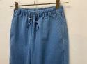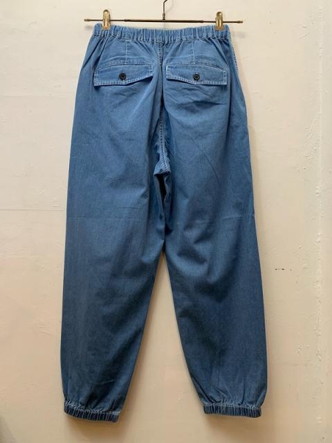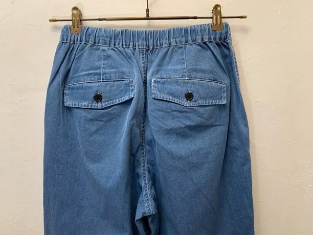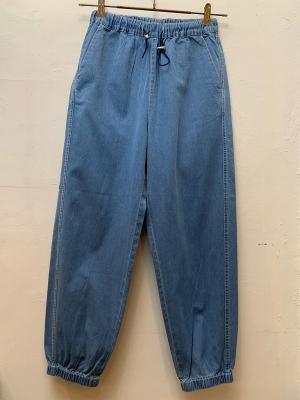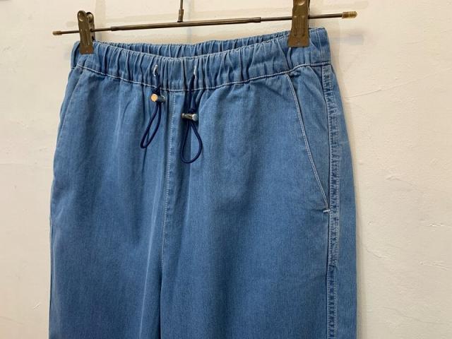シャンブレライクのデニム生地を使用したイージーパンツ。ウエストに金属のストッパーを使用し、飾りにもなりますがさらに紐を絞っても調整が効きます。光沢が上品見えする、軽くて便利なカジュアルアイテムです。