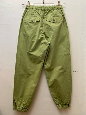 ハリがありながらも薄手のシャツ地のような生地を使用したイージーパンツ。ゴム仕様のウエストは履き心地抜群で、様々なアイテムに合わせやすいシルエットです。紐についた金属のストッパーがポイントでサイズ調整も可能です。