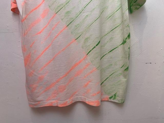 グリーンとピンクの配色が見事な染めのTシャツです。柔らかな肌触りで夏も快適に過ごすことができます。合わせられるアイテムのバリエーションが広く使いやすいアイテムです。