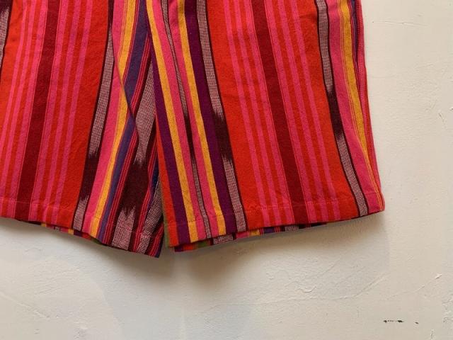 マルチカラーのストライプショートパンツです。赤をベースにした遊び心満載のカラーリングが目を惹きます。個性を引き出し、存在感のあるアイテムです。ウエストはゴムと紐の仕様なのでリラックスして履き続ける事が可能です。