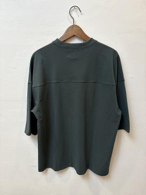 少しゆったりとした寸法の七分袖のTシャツです。軽くバイオ加工をかけているため表面のフェード感と微妙な接触冷感もこのアイテムの特徴です。