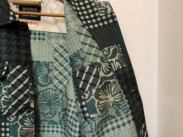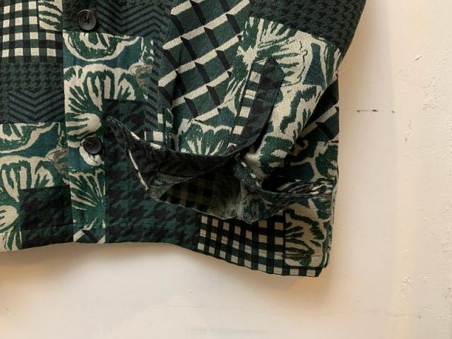 グリーンをベースにしたパッチワークの一枚地ジャケット。千鳥、チェック、フラワー等の生地が絶妙にMIXされ、見る人着る人を飽きさせないデザインになっています。遊び心がありながらも上品見えする、特別なジャケットです。胸ポケット×2、サイドポケット×2、内側にも胸ポケットが付属。
