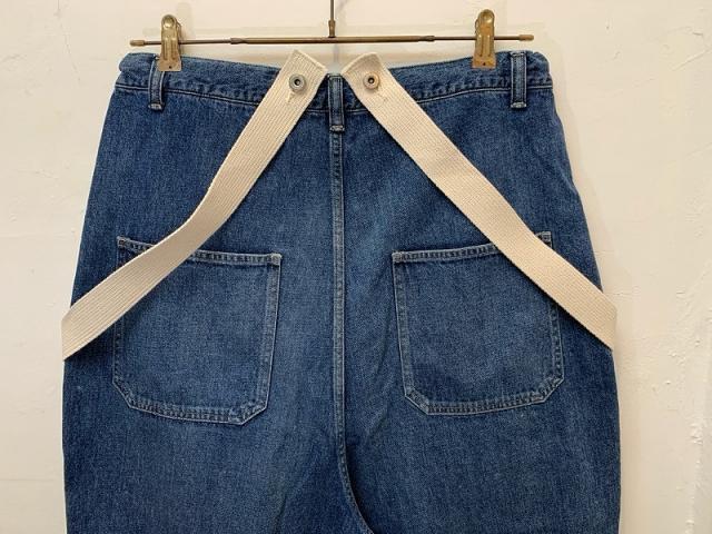 一年を通して着やすい10.5オンスのデニムを使用したサスペンダー付きパンツ。Tシャツの上にさらっと着られるオーバーサイズで、US NAVYのデッキパンツのような大きなパッチポケットが特徴です。サスペンダーは取り外し可能で、外した際はウエスト紐で調整することもできます。