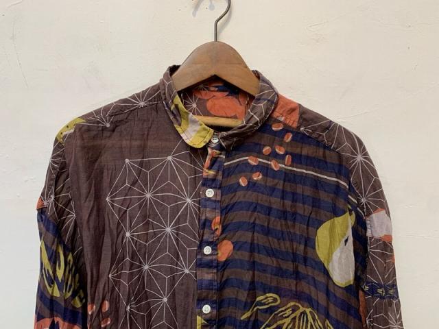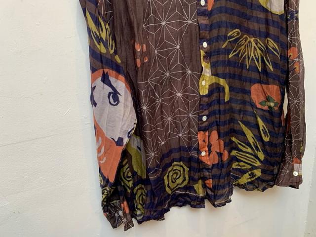 KusaKanmuriのストール柄を使用し、シャツに仕立てました。薄手ですが重ね着のコーディネートにもおすすめです。ゆったりとした身幅でフリーサイズで着れるサイジング。シルクコットンの上品な素材感そのままにお楽しみください。
