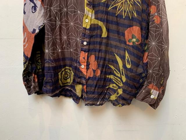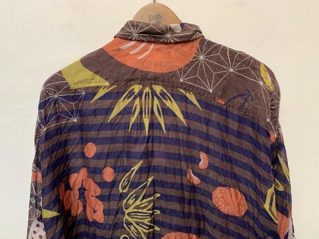KusaKanmuriのストール柄を使用し、シャツに仕立てました。薄手ですが重ね着のコーディネートにもおすすめです。ゆったりとした身幅でフリーサイズで着れるサイジング。シルクコットンの上品な素材感そのままにお楽しみください。