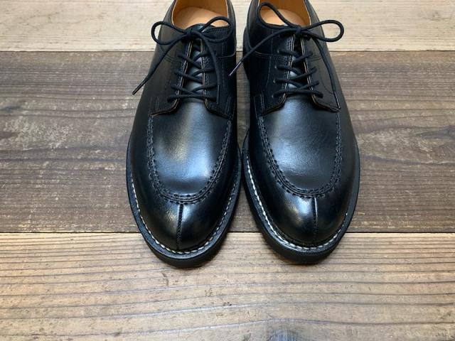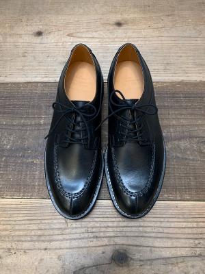 薄く細く伸びたUチップのアッパーにタフなVIBRAMソールを使用し、グッドイヤーウェルト製法で作製しました。手に持つと少しソールの重さを感じますが、履くと重さはあまり感じられずクッション性があり履き心地の良いシューズです。レザーソ-ルと比べるとクッション性がある分疲れにくいです。