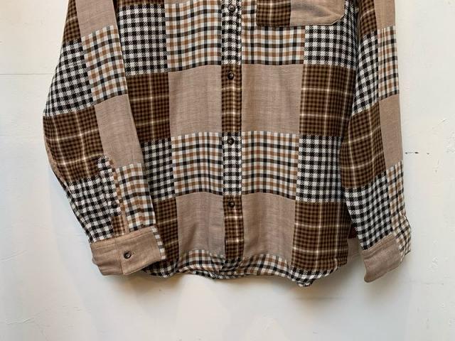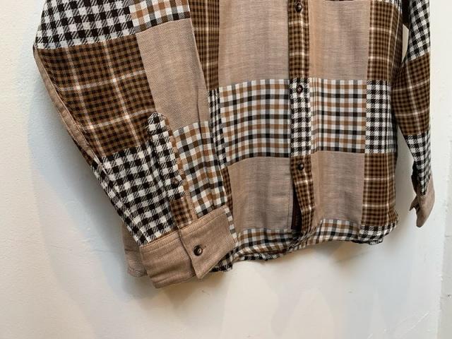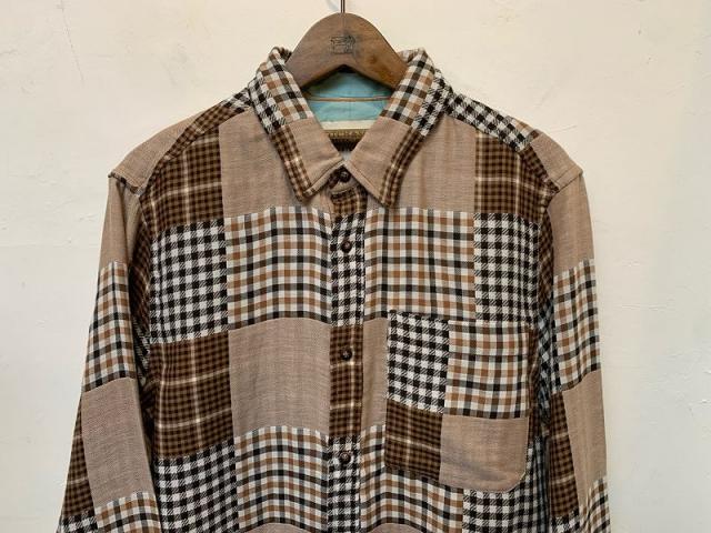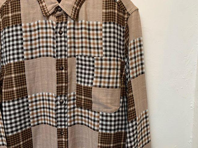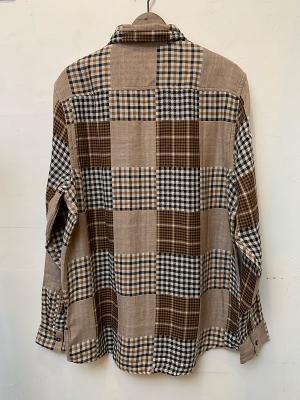 楽しいデザインのパッチワークシャツ。パッチワークはチェック生地を中心に組み立てられ、優しい色味ですがコーディネートのアクセントになります。ポケット付きでちょっぴり長め、男性はもちろん女性にも。